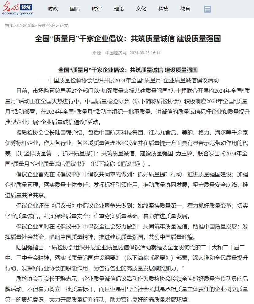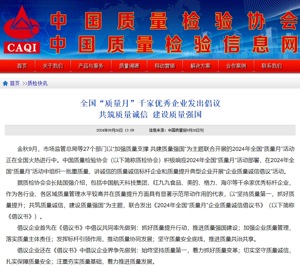 每年9月是全國“質量月”,由市場監管總局等27個部門以“加強質量支撐 共建質量強國”為主題,聯合開展的“質量月”活動。在2024年全國“質量月”活動中組織一批重質量、講誠信的質量誠信標桿企業和質量提升典型企業開展“企業質量誠信倡議”活動。 其中,包括重慶紅九九食品等千余家優秀標桿企業,以“堅持質量第一,抓好質量提升;共筑質量誠信,建設質量強國”為主題,聯合發出《2024年全國“質量月”企業質量誠信倡議書》(以下簡稱《倡議書》)。 倡議企業首先在《倡議書》中倡議共同率先做到:抓好質量提升行動,推進質量強國建設;加強企業質量管理,落實質量主體責任;發揮標桿引領作用,推動質量協同發展;堅守質量安全底線,推進質量共治共享。 倡議企業還在《倡議書》中倡議企業界爭先做到:始終堅持質量第一,著力抓好質量變革;切實堅守質量誠信,扎實保障質量安全;注重夯實質量基礎,著力推進質量發展。 倡議企業同時在《倡議書》中倡議全社會努力做到:共同筑牢質量誠信,助推中國質量發展;發揮質量社會共治,唱響中國質量精神;推進建設質量強國,共創中國質量輝煌。 (中國經濟網報道)