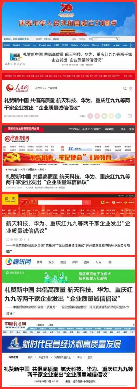中國質量檢驗協會(以下簡稱質檢協會)在活動中組織重慶紅九九食品等近兩千家重質量、講誠信的質量誠信標桿企業和質量提升典型企業,開展“企業質量誠信倡議”專題活動。并以“堅持質量第一 抓好質量提升 共筑質量誠信 建設質量強國”為主題,以人民為中心,樹立消費者至上的理念,把維護廣大群眾的根本利益作為“質量月”活動的出發點和落腳點,聯合發出《2019年全國“質量月”企業質量誠信倡議書》,倡議企業界爭先做到弘揚工匠精神、齊抓質量提升、重視質量發展、共創中國質量,以優異成績慶祝中華人民共和國成立70周年。此次活動引起社會廣泛贊譽。